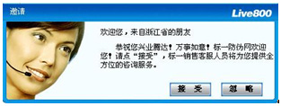 Live800在線請點擊主頁右上角浮動圖標(biāo),或在彈出選擇框中點擊接受,將出現(xiàn)如下對話框,標(biāo)一客服隨時恭候。
