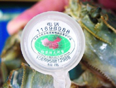 為了避免其他大閘蟹冒充陽澄湖大閘蟹,陽澄湖大閘蟹每年都更換防偽指環(huán) ,今年的防偽指環(huán)將正面的背景色改成了綠色,指環(huán)上方標著防偽查詢電話,下方標著短信查詢號碼,背面則是網(wǎng)狀的密封格,揭開后是一個查詢編碼。據(jù)介紹,這個編碼是每只蟹子一個,而且整個防偽指環(huán)是一次性的,必須要撕毀后才能取下,以防被二次使用。