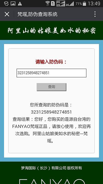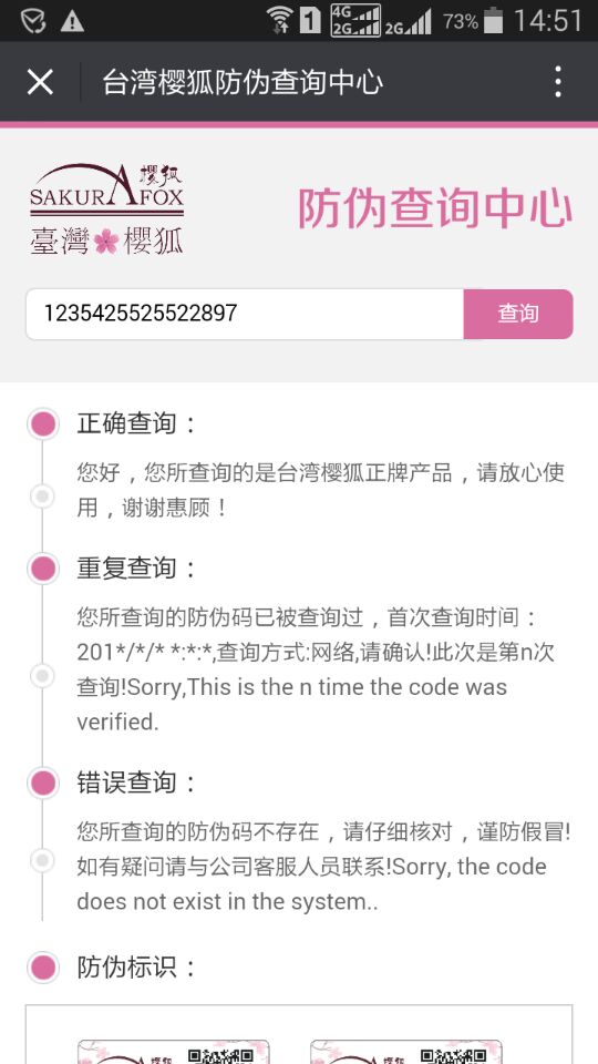 目前,應(yīng)用企業(yè)微信公眾號(hào)或訂閱號(hào)進(jìn)行防偽查詢是非常普遍的防偽方式,為了更好的展現(xiàn)企業(yè)形象,提升客戶的信任度,標(biāo)一防偽為您量身定制個(gè)性化的查詢頁(yè)面,即相應(yīng)的查詢頁(yè)面可以根據(jù)您的要求進(jìn)行內(nèi)容和版式定制。具體案例如下: