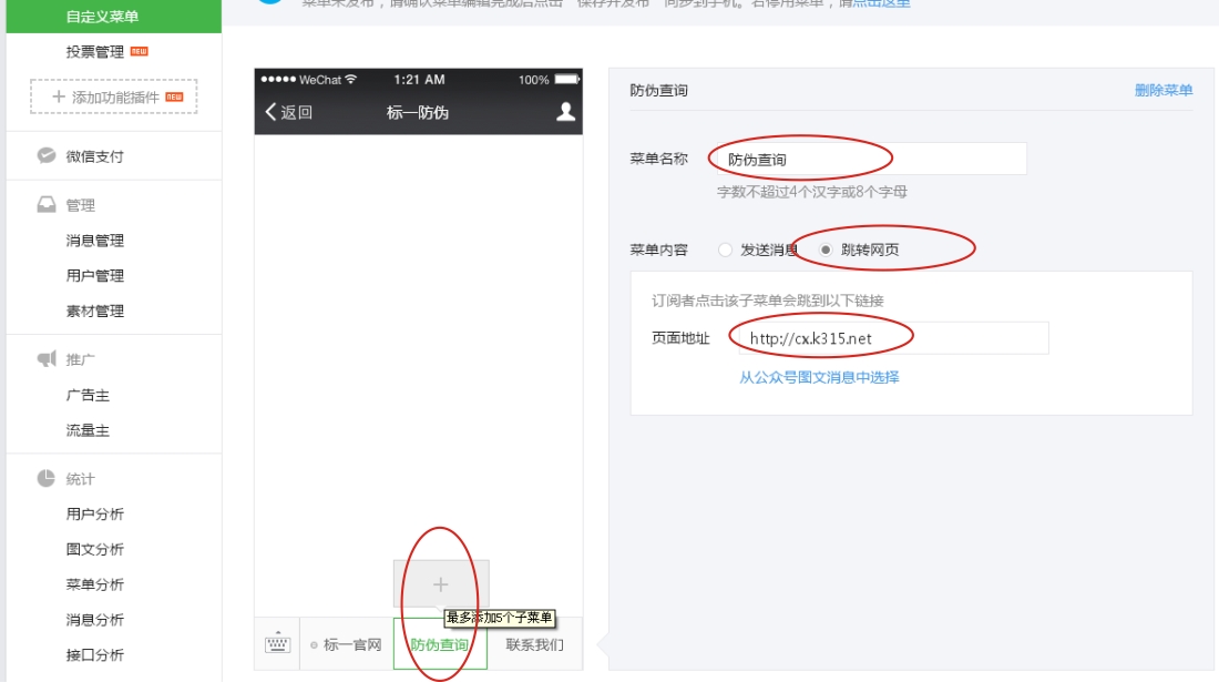 添加的鏈接可以是默認(rèn)防偽查詢地址http://cx.k315.net(手機(jī)版),也可以是專門制作的網(wǎng)頁,也可以企業(yè)自己微網(wǎng)站的某一頁面。