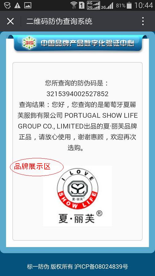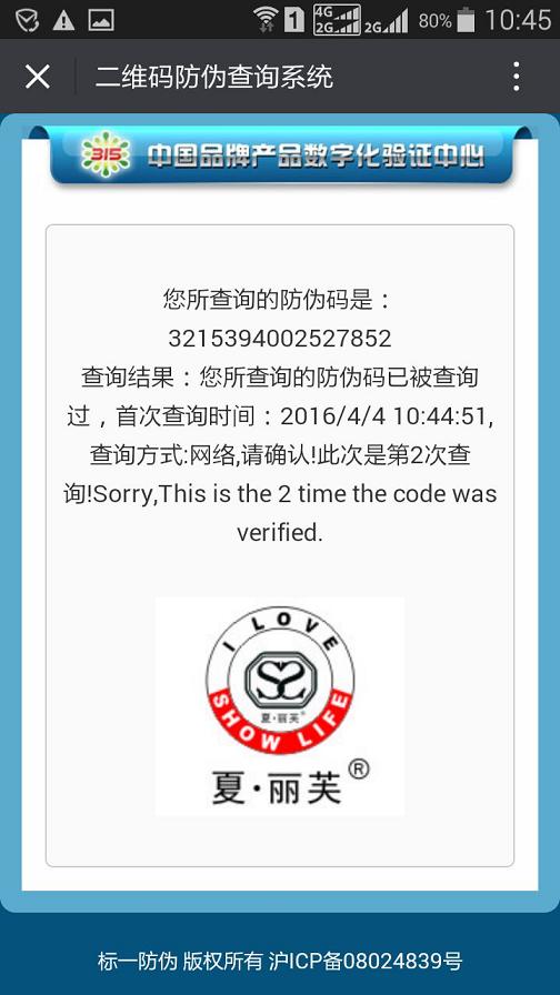 可變二維碼即每個(gè)標(biāo)簽上的二維碼都是不一樣的,不重復(fù),只能一次查詢有效等特性,其查詢結(jié)果的頁面有兩種情況,一是用我公司提供的標(biāo)準(zhǔn)化通用型的頁面,二是通過定型個(gè)性化的查詢結(jié)果頁面。以下主要介紹有關(guān)通用型的案例及相關(guān)過程結(jié)果。